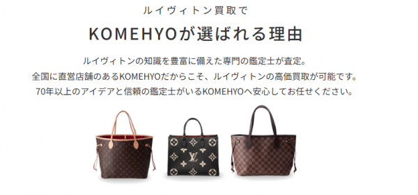 全国に直営店舗のあるKOMEHYOだからこそ、ルイヴィトンの高価買取が可能です。専任の熟練鑑定士がお客様の大切なお品物を正確に、そして誠実に査定させていただきます。ぜひお気軽にご利用、ご相談くださいませ。